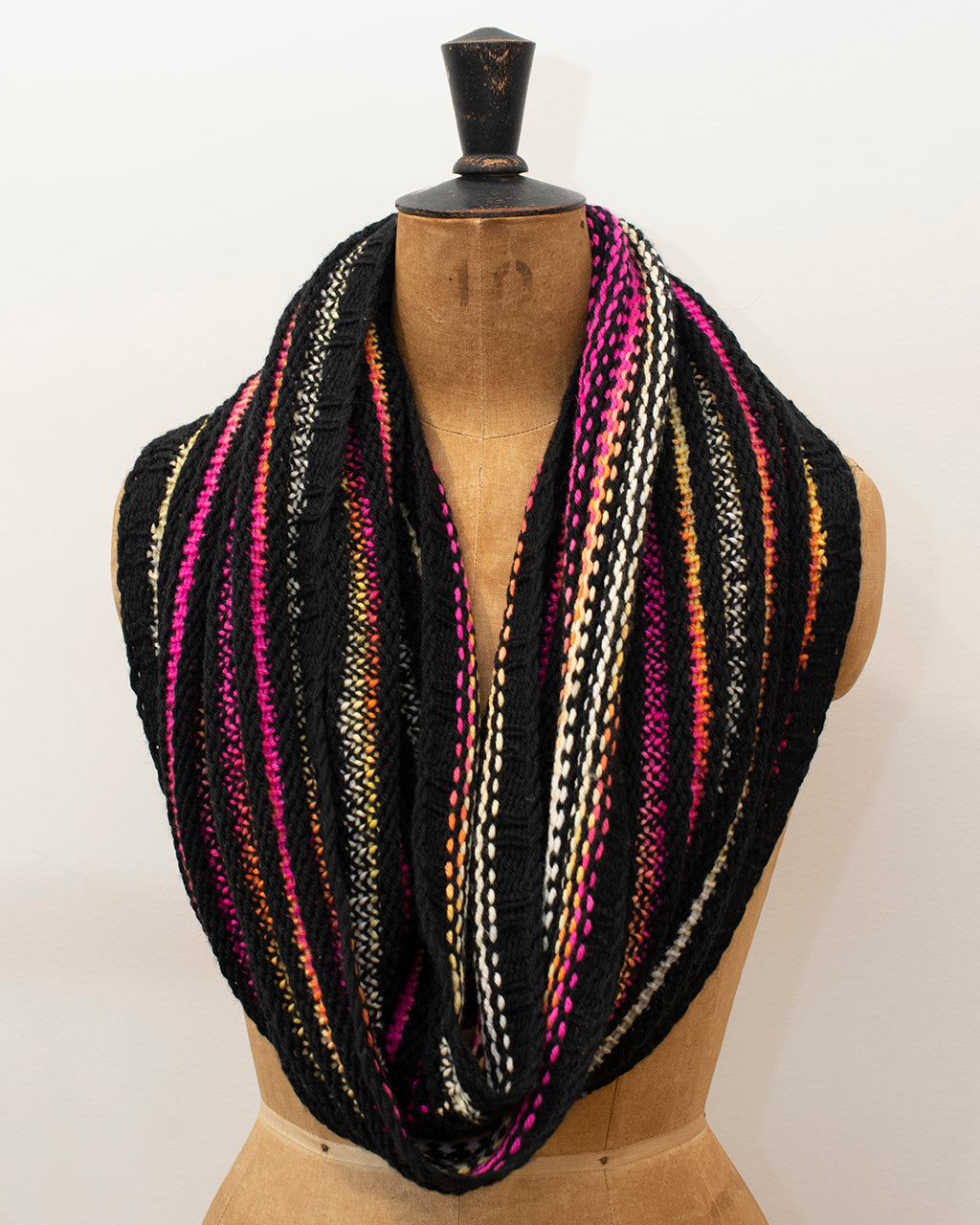 The All Sorts of Licorice cowl can be worn wrapped two OR three times around the neck as shown in the pictures.
